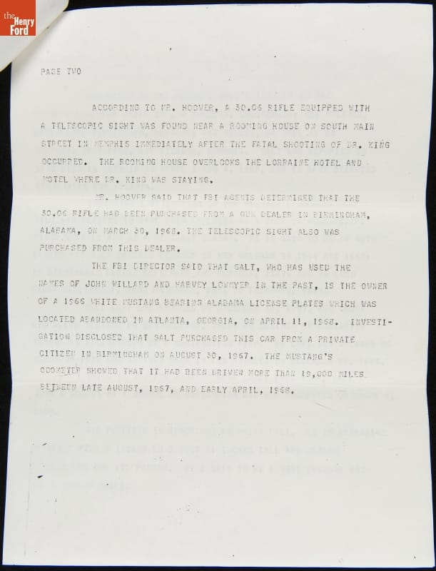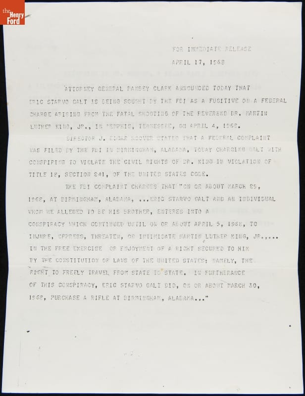 A nationwide manhunt began after Dr. Martin Luther King, Jr. was fatally shot on April 4, 1968. The FBI at first identified the assassin as Eric Starvo Galt -- an alias of James Earl Ray -- and issued dispatches with that name to various law enforcement agencies. On June 8, 1968, British police apprehended Ray at a London airport as he tried to flee to Rhodesia.
