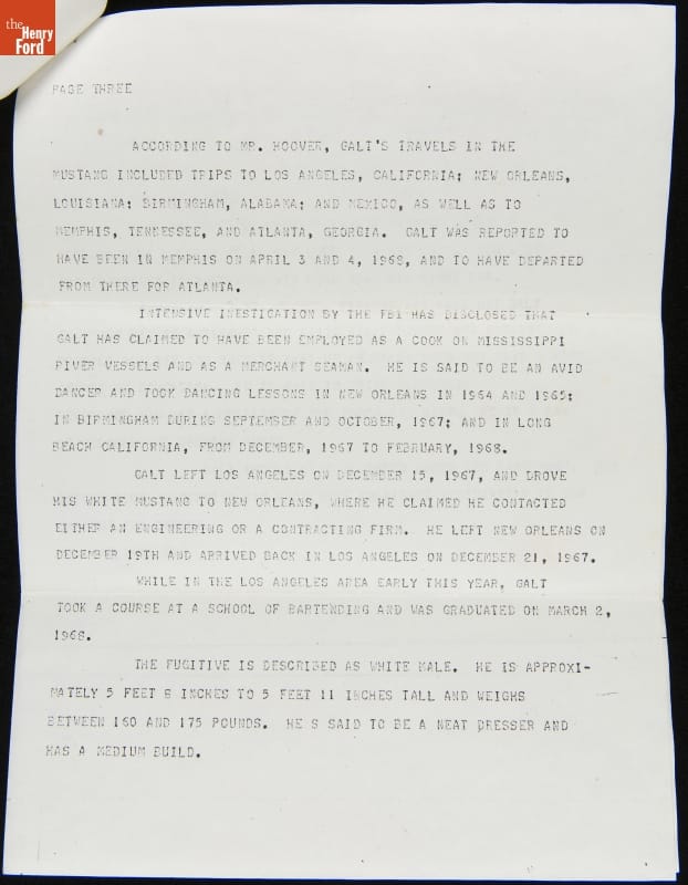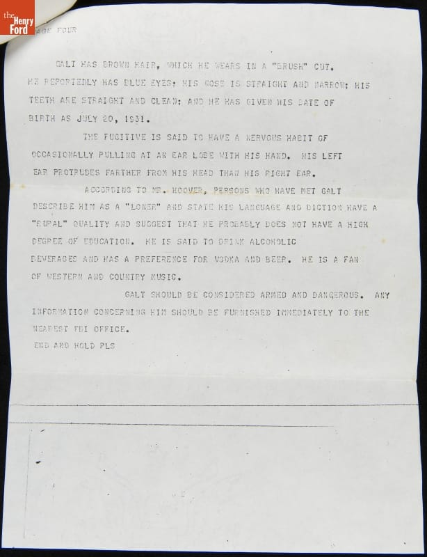 Teletype Message, FBI Seeking Eric Starvo Galt during the Martin Luther King, Jr. Assassination Investigation, April 17, 1968