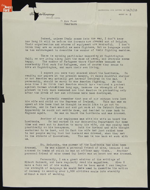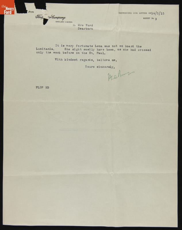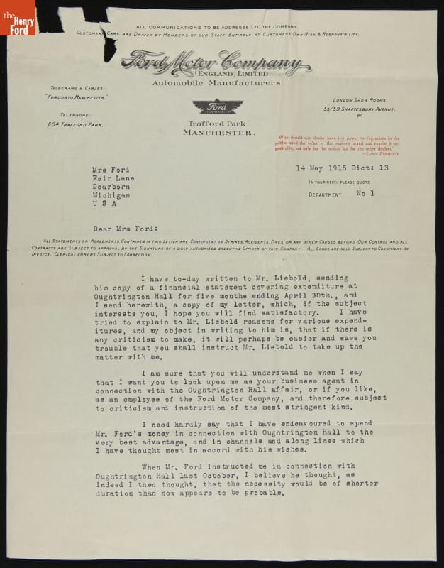 Correspondence from Sir Percival Perry to Clara Ford and E.G.Liebold regarding Oughtrington Hall Finances and the "Lusitania" Sinking, May 1915