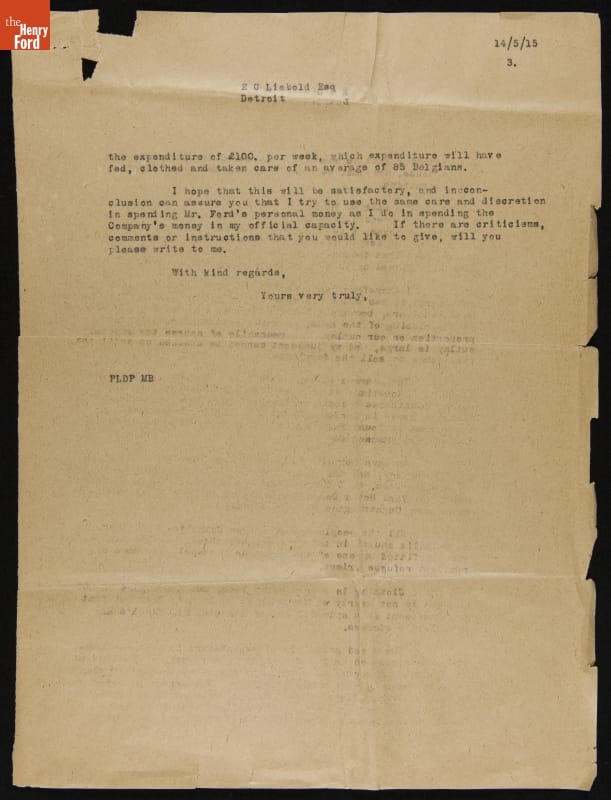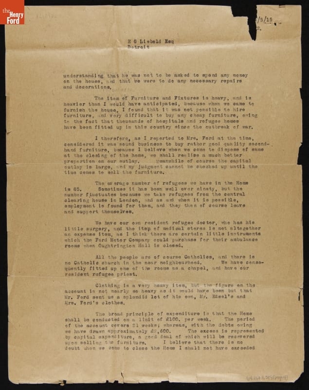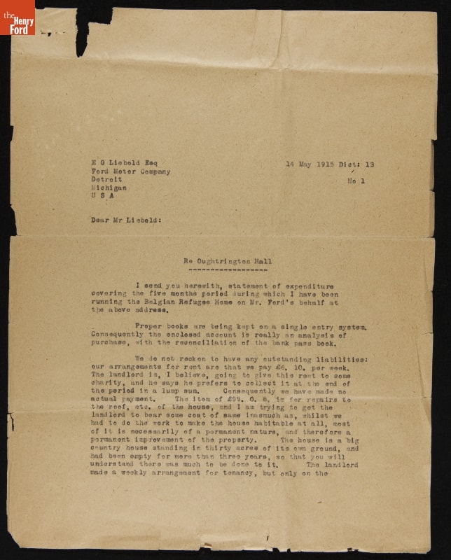 Percival Perry, chairman of Ford Motor Company Limited (Ford of Britain) during World War I, relayed the plight of Belgian refugees to Henry and Clara Ford. With their authority, Perry leased Oughtrington Hall to accommodate a select group of Belgian refugees. Perry corresponded regularly with Clara Ford to update her and her husband on the progress of the project.