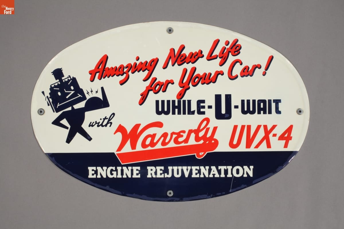 Automobile service stations were usually plastered with signs like this one that advertised the many products and services they offered. The Waverly UVX-4 engine rejuvenation was an additive--applied while customers waited--that promised to impart "amazing new life" to their car.