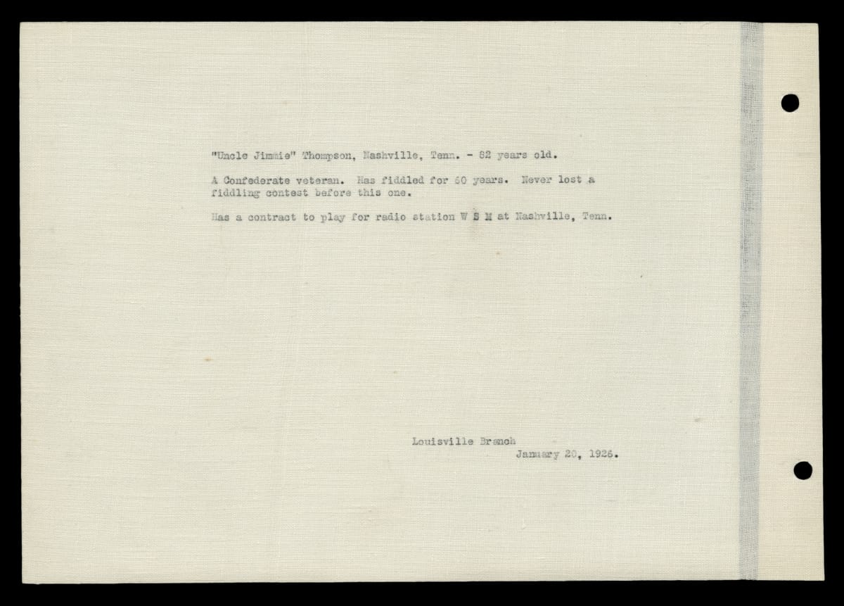 Jesse Donald "Uncle Jimmy" Thompson began playing fiddle as a boy in Texas. Later in life he competed in fiddling contests, including one sponsored by a Kentucky Ford dealer in 1926. Thompson's most notable performance was in Nashville on November 28, 1925, when he became the first artist featured on WSM radio's Barn Dance -- soon renamed the Grand Ole Opry.