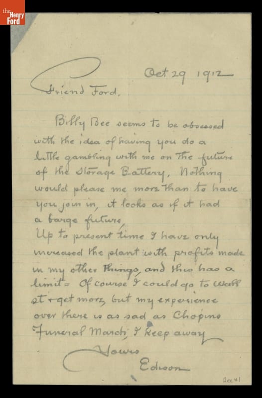 Letter from Thomas Edison to Henry Ford, October 29, 1912