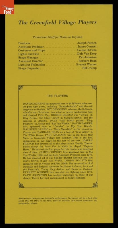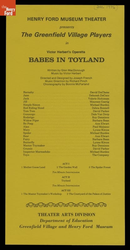 Playbill for Performance of "Babes in Toyland" at Henry Ford Museum Theater, 1976-1977