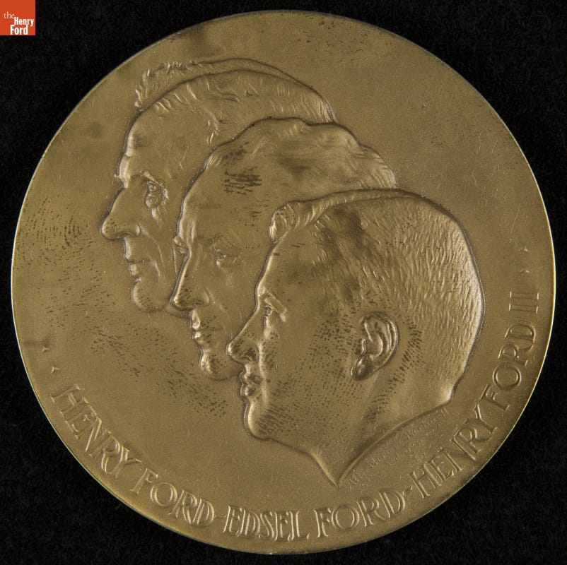 The Ford Motor Company commissioned a medallion to commemorate the 50th anniversary of the company's founding. The medallion, based on artwork created by Norman Rockwell, depicts profiles of the company's three leaders from 1903 to 1953: Henry Ford, the company's founder; Edsel, Henry's son and company president from 1919-1943; and Henry Ford II, Henry's grandson who led the company into the next fifty years.