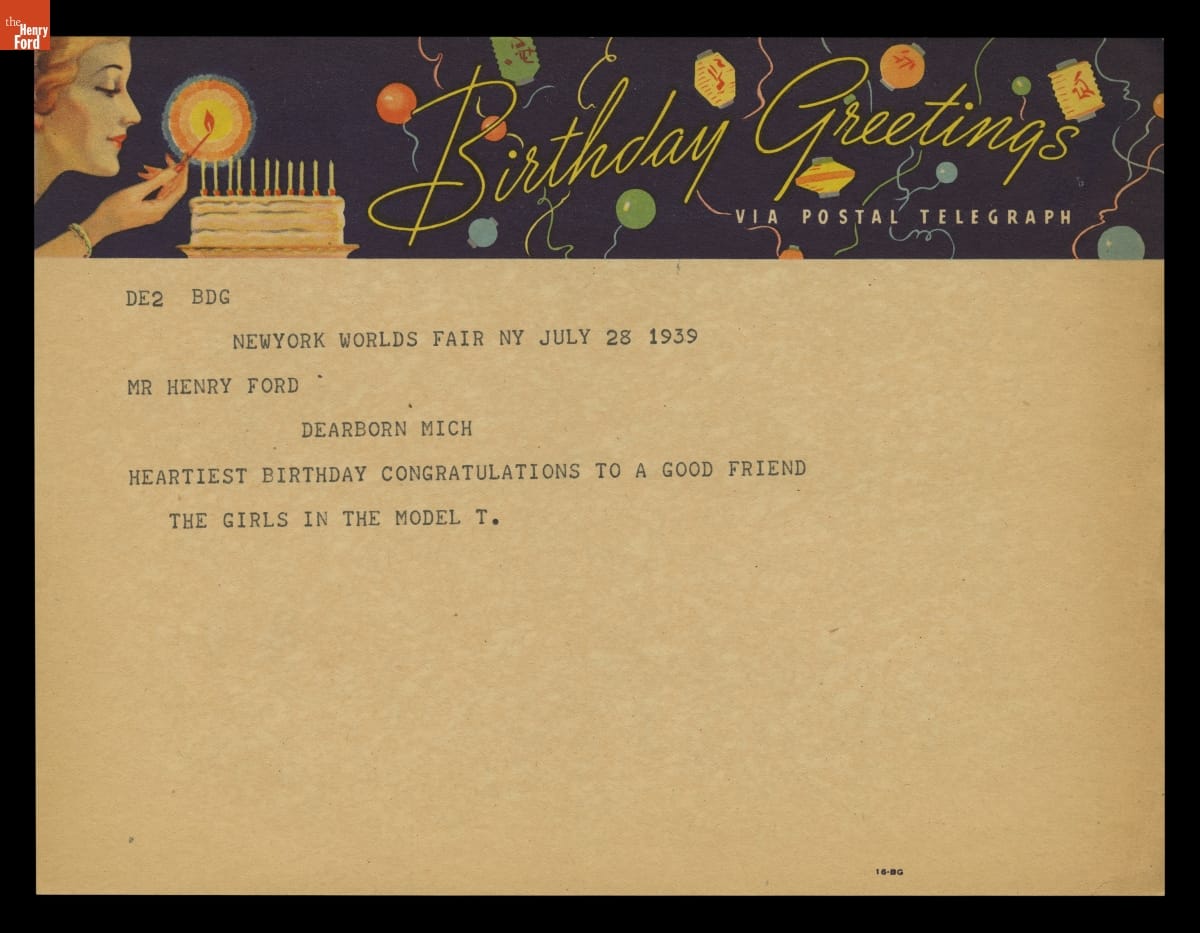 Birthday Greetings Telegram from "The Girls in the Model T" to Henry Ford, July 28, 1939