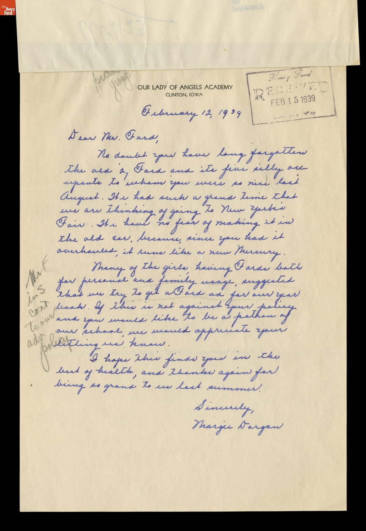 Correspondence between Marge Dorgan and the Office of Henry Ford, February 1939