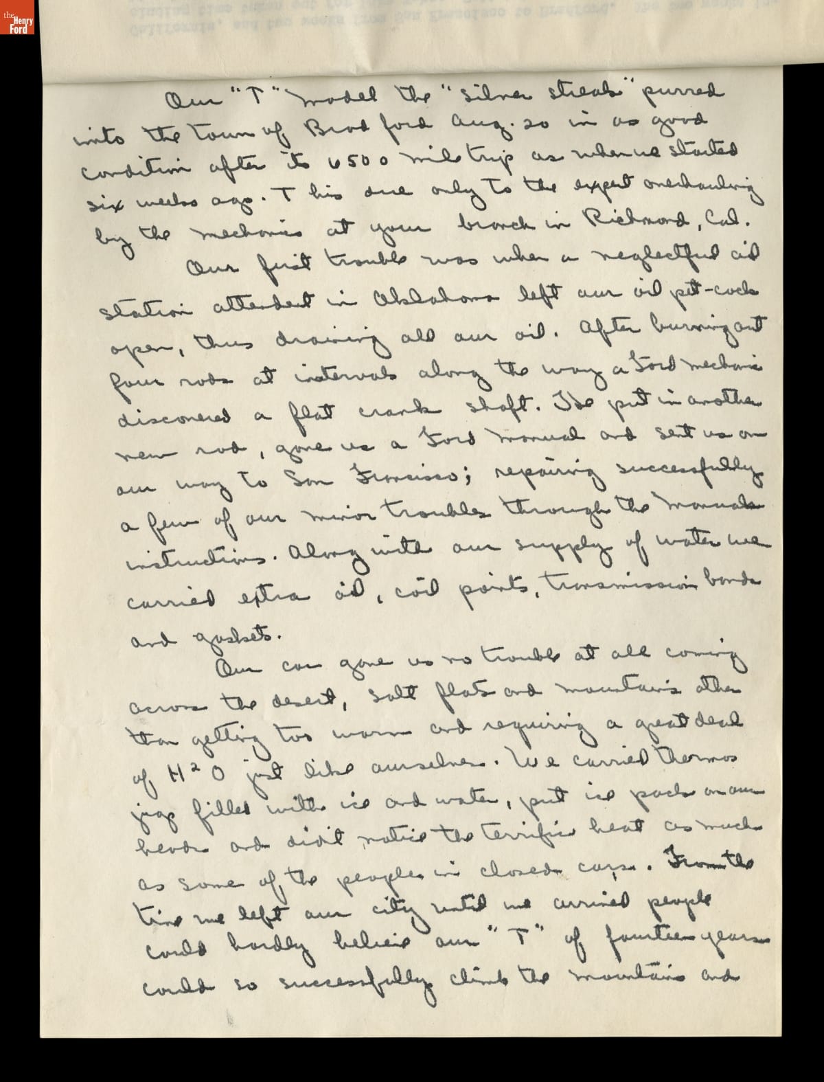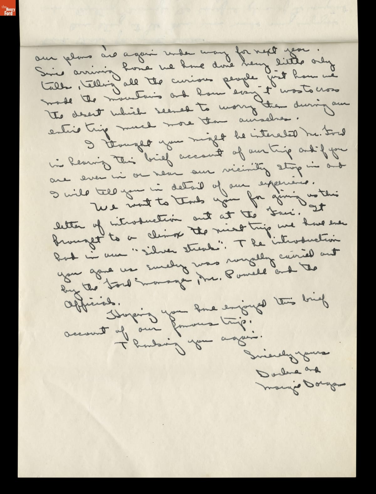 Darlene Dorgan, accompanied by four or five young women, spent summer vacations during the 1930s and early 1940s traveling in her 1926 Model T. The carefree troupes from Bradford, Illinois, roamed the United States and Canada in the self-painted silver "T". After driving to Dearborn, Michigan, to wish Henry Ford a happy birthday in 1938, the group kept in touch with the famed automaker.