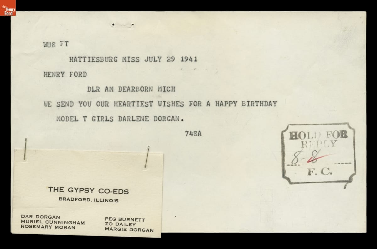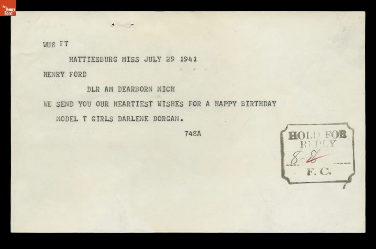 Birthday Greeting Telegram to Henry Ford from Darlene Dorgan and the "Model T Girls," July 29, 1941