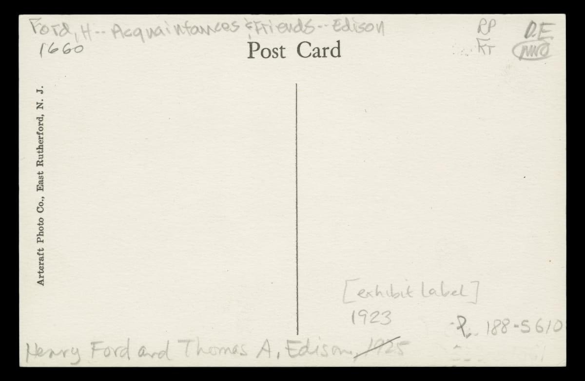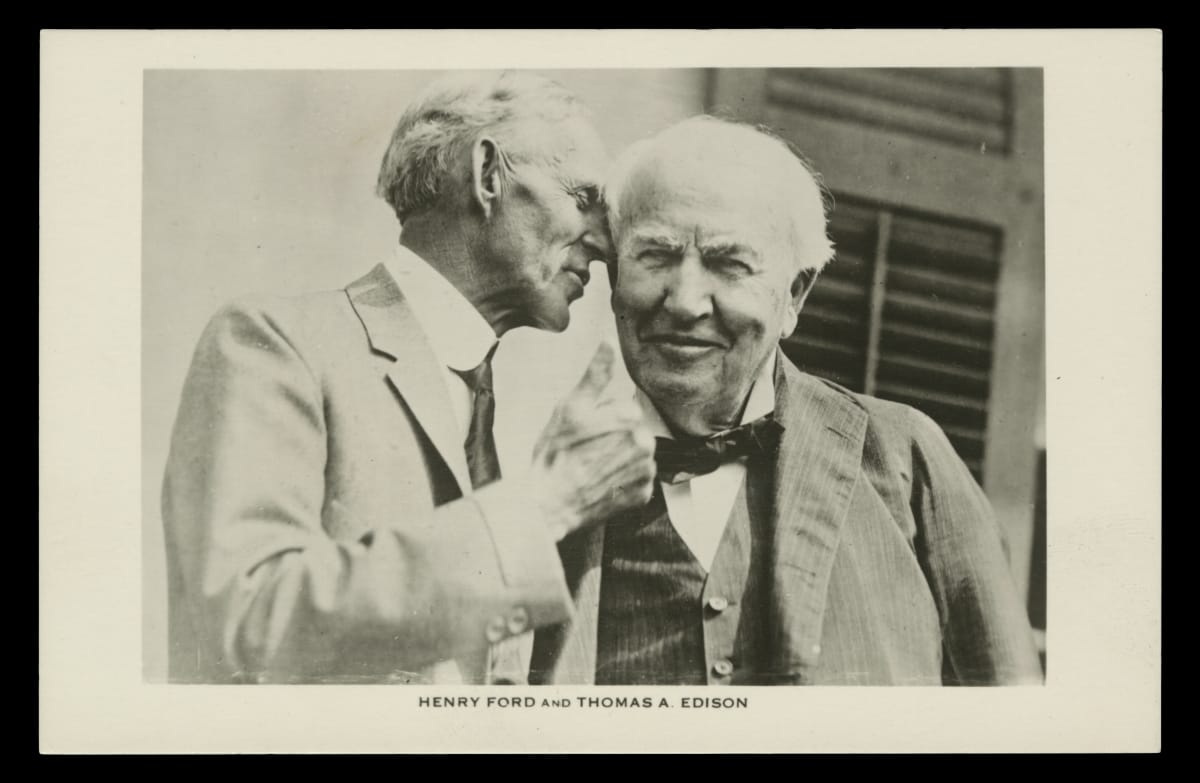 Thomas Edison was both a mentor and a friend to Henry Ford. While this photograph, taken in 1925, suggests the notion of Ford whispering something to Edison, reality was quite the opposite. From childhood, Edison experienced hearing loss that advanced with age. For Edison to hear him, Ford spoke loudly and directly into the inventor's ear.