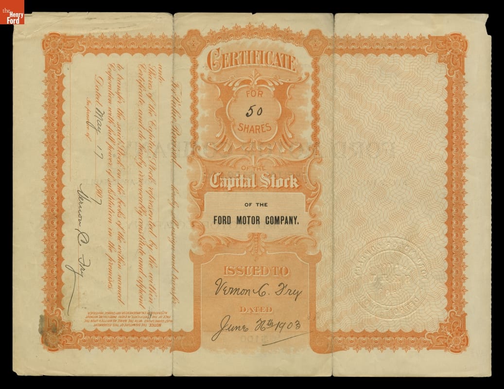 This is one of the first shares of stock in Ford Motor Company, Henry Ford's third attempt to establish a successful car company. This time Ford had the crucial support of Alexander Malcomson, a wealthy Detroit coal merchant. Malcomson was vital in finding investors -- like Vernon C. Fry, Malcomson's cousin, to whom this certificate was issued.