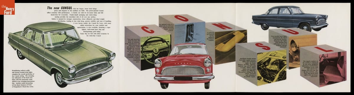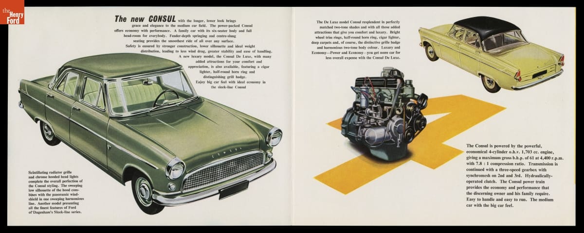 Ford of Britain, Ford Motor Company's subsidiary in the United Kingdom, manufactured the Consul over two design generations from 1951 to 1962. The car featured a four-cylinder engine and was available in sedan, convertible and station wagon body styles. The Mark II version, introduced in 1956, featured all-new styling along with a more powerful engine and larger overall dimensions.