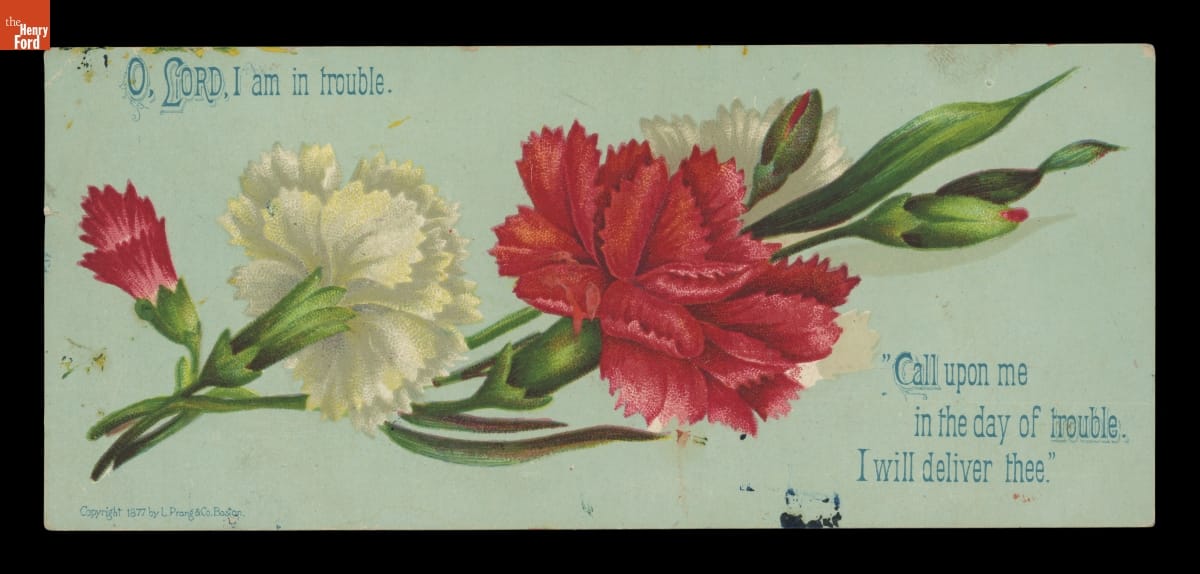 Louis Prang, a German immigrant printer, created a variety of colorful, chromolithographed trade, album, motto, and greeting cards, as well as other prints and publications in the late 1800s. Many of these materials featured flowers, one of Prang's favorite subjects. Religious text highlights this carnation-print card from 1877. Prang also reused this flower print for a Christmas card.