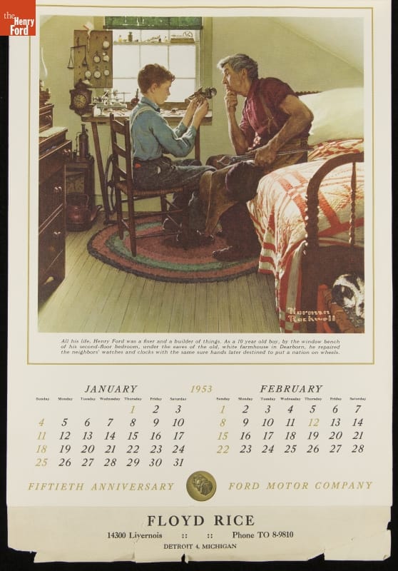Henry Ford II, president of Ford Motor Company, commissioned a calendar from the celebrated American illustrator Norman Rockwell to commemorate the company's 50th anniversary in 1953. Ford offered a small version, described as a home calendar (seen here), and a larger community calendar. The home calendar featured six Rockwell images and a cover page with an image of the three Fords who served as company President.