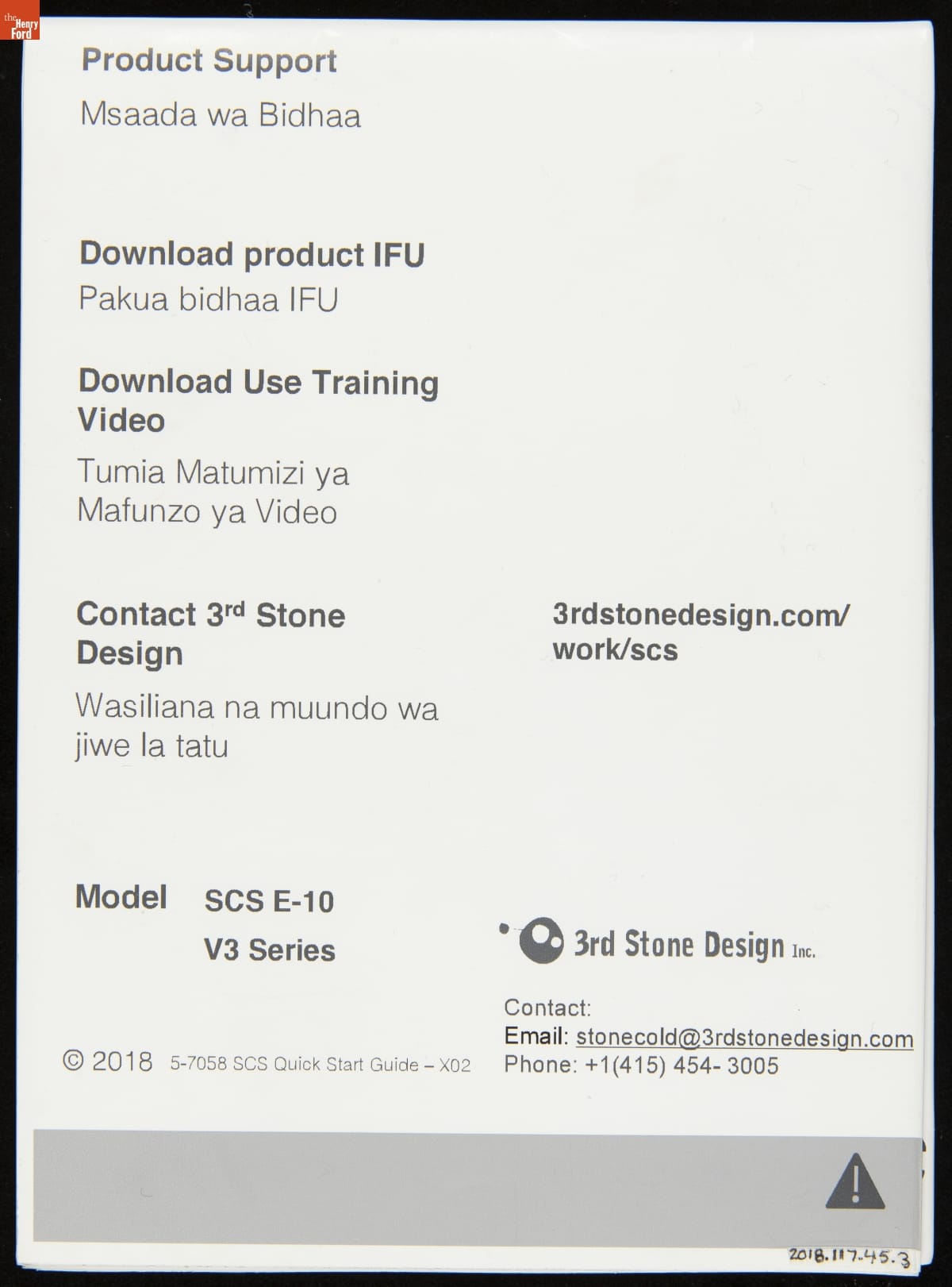 STS / Stone Cold Systems / Model: SC5 E-10 / SN V3-13 / UNIT FOR DEMONSTRATION / PURPOSE ONLY / [specifications] / Manufactured By / 3rd Stone Design Inc. / 30 Castro Avenue, / San Rafael, CA-94901 / [...] / Manufactured On: / MAR2018 / [...] / Made in USA