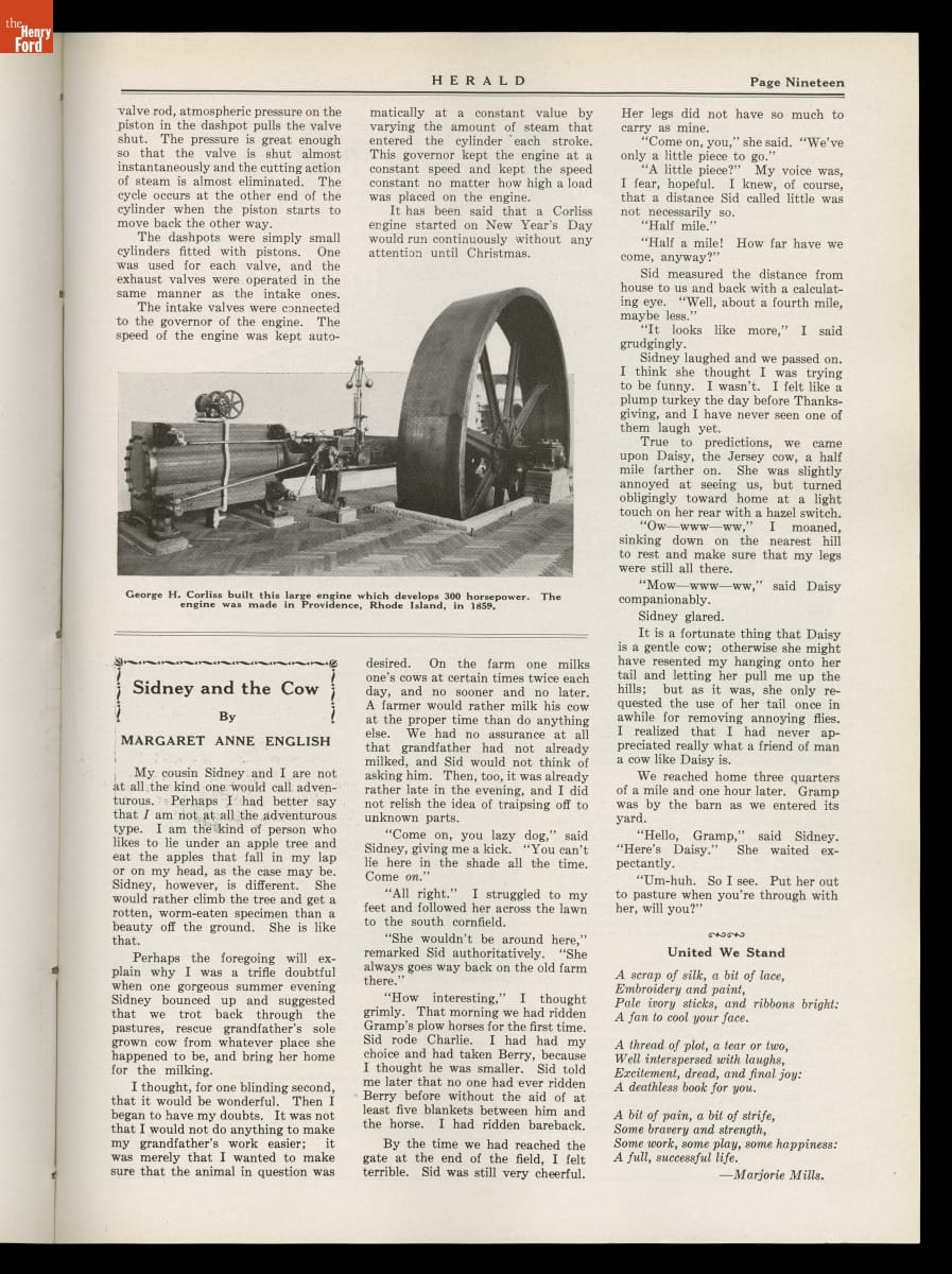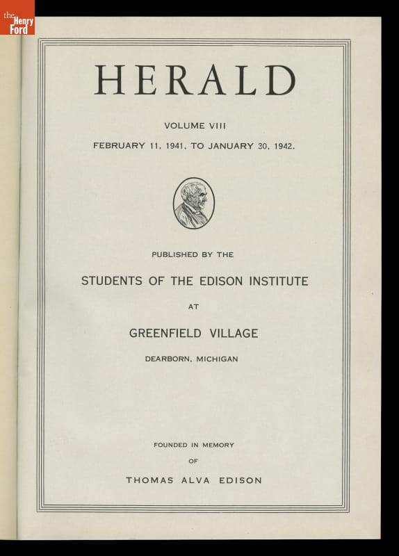 The students of the Greenfield Village and Associated Schools of the Edison Institute began publishing the Herald in 1934. They took the name from a weekly newspaper printed and sold by Thomas Alva Edison when he worked for the Grand Trunk Railroad in 1862-63. The students' version included articles on academic, social, and recreational activities. The publication continued until 1952.