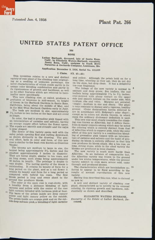 U.S. Plant Patent 266, for Luther Burbank Rose, Granted to Elizabeth Waters Burbank, January 4, 1938