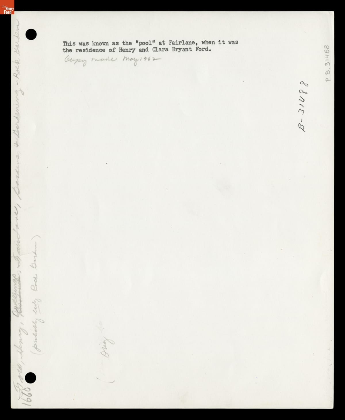 In the early 1910s, Henry and Clara Ford selected 1300 acres of farmland in Dearborn, Michigan, as the site for a new home. They called the estate Fair Lane. Surrounded by woods, meadows, gardens, and the nature they loved, Henry and Clara found this home a peaceful respite. This image shows one of the gardens created near the house for the couple to enjoy.