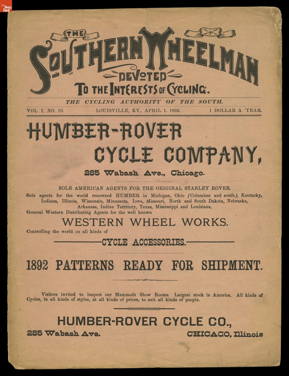British manufacturer Rover popularized a new bicycle design in 1885. It featured two wheels of equally modest size and a chain-and-sprocket drive. The Rover "safety" bike was easier to mount and ride than the high-wheel bicycles that came before it. This issue of The Southern Wheelman included an advertisement for Rover cycles.