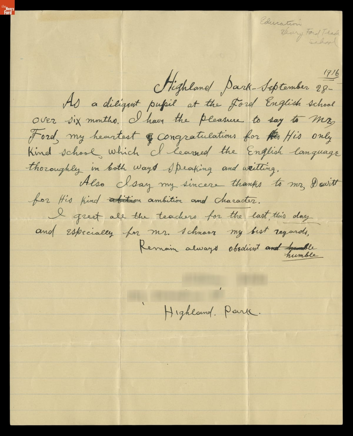 Letter from a Ford English School Student to Henry Ford, September 28, 1916