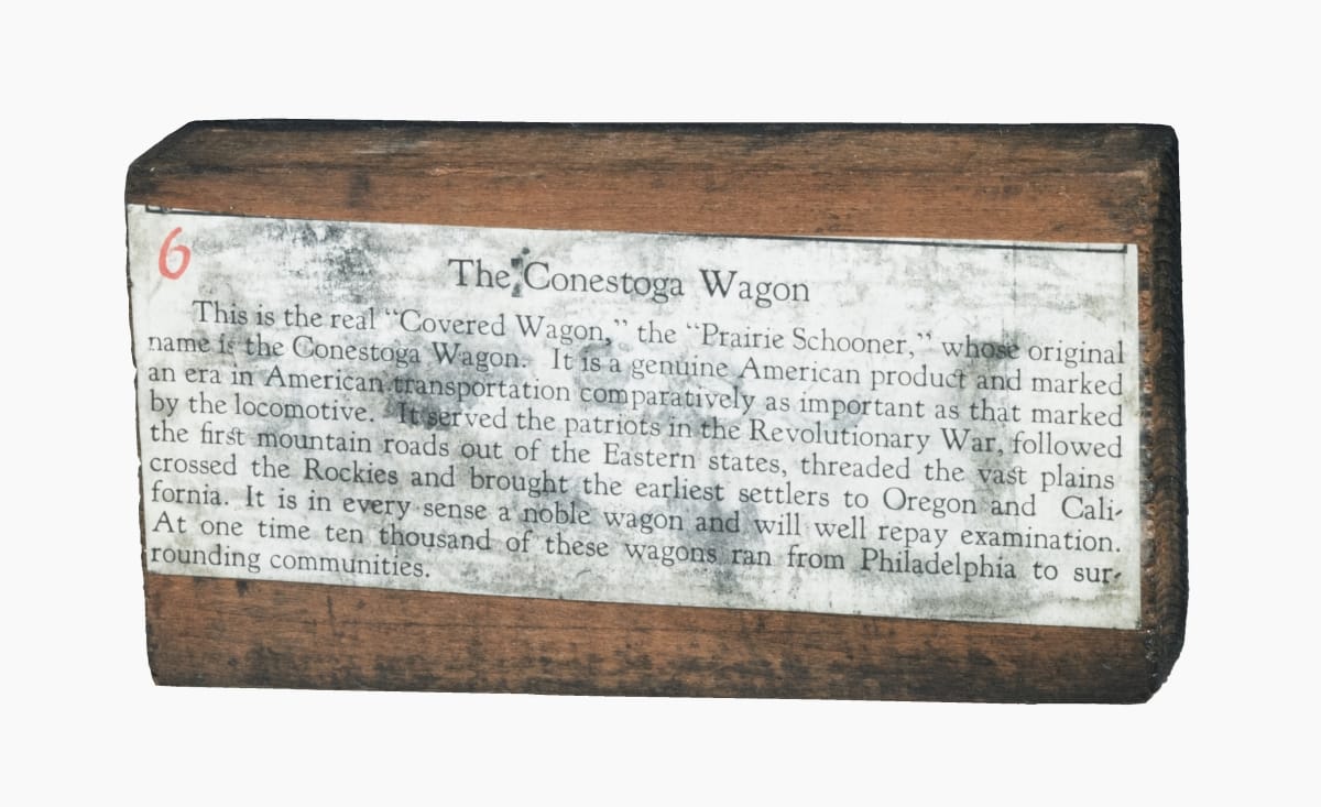 The Conestoga Wagon / This is the real "Covered Wagon," the "Prairie Schooner," whose original / name is the Conestoga Wagon. It is a genuine American product and marked / an era in American transportation comparatively as important as that marked / by the locomotive. [...]