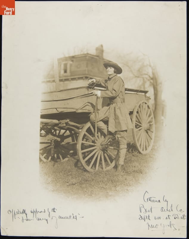 After the United States entered World War I in 1917, Americans worried about labor and food shortages as a result of men going off to fight. Organizations like the Woman's Land Army of America and the Woman's National Farm and Garden Association recruited and trained women to perform agricultural work across the country. This woman modeled the Land Army uniform.