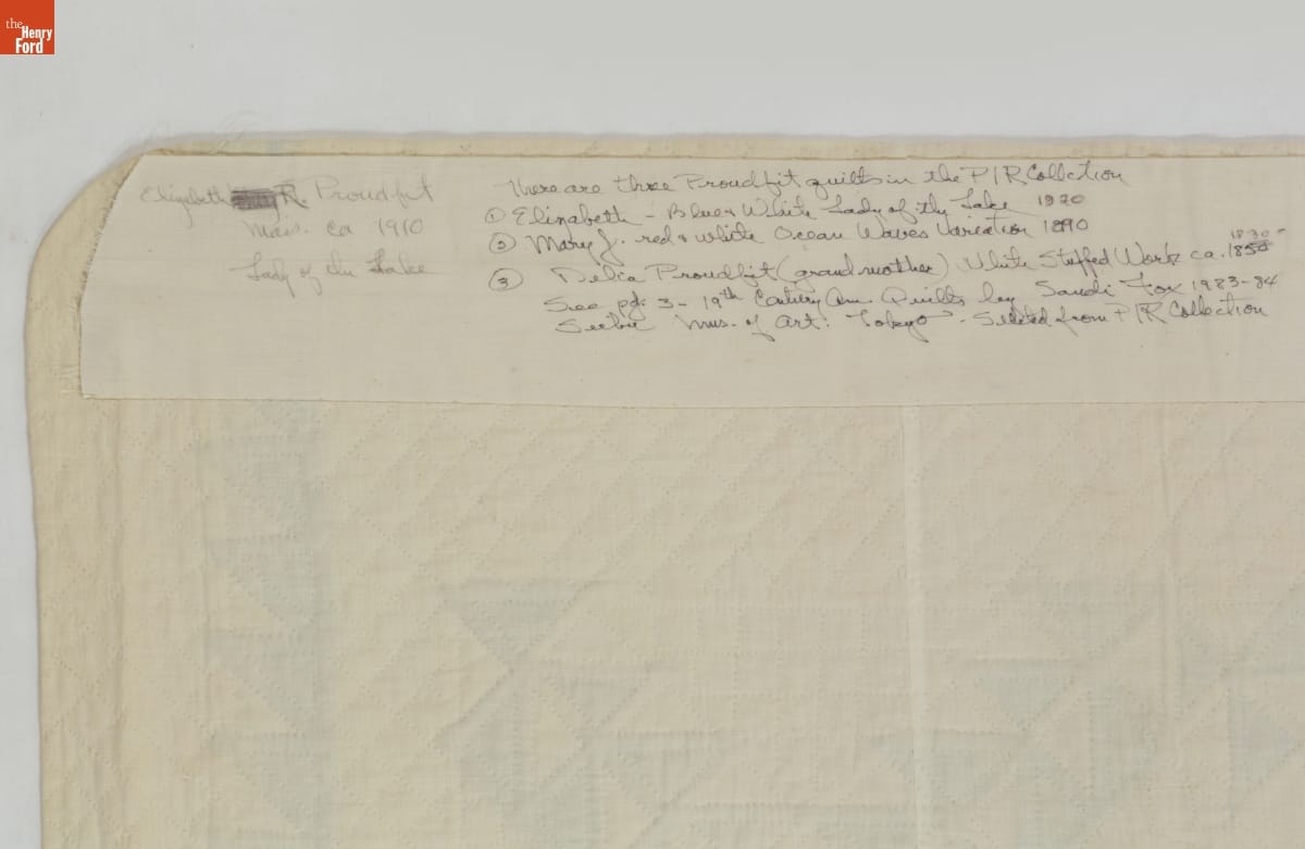 There are three Proudfit quilts in the P|R Collection / 1 [circled] Elizabeth - Blue & White Lady of the Lake 1920 / 2 [circled] Mary J. red & white Ocean Waves Variation 1890 / 3 [circled] Delia Proudfit (grandmother) White Stuffed Work ca. [1850 crossed out] 1830 / See pg. 3 - 19th Century Am Quilts by Sandi Fox 1983-84 / Seibu Mus. of Art Tokyo. Selected from P|R Collection.