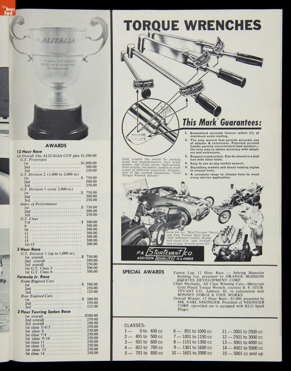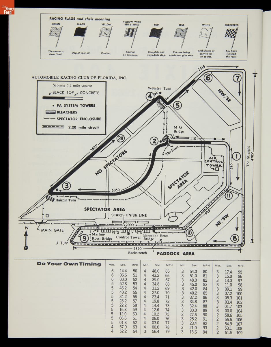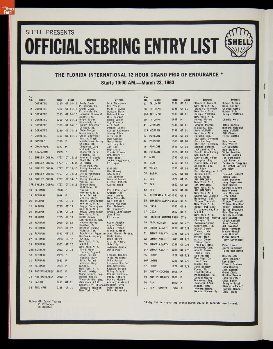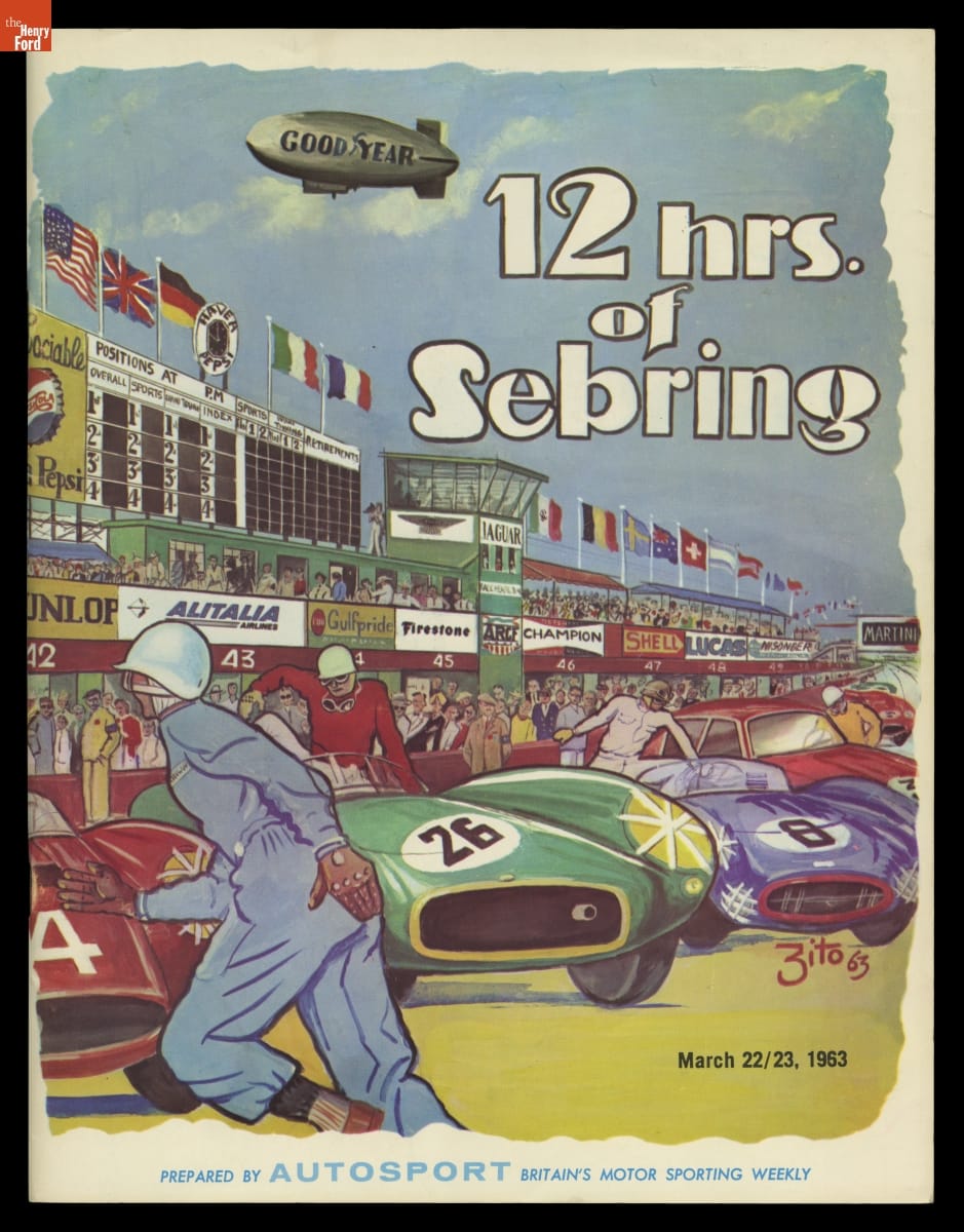 First run in 1952, the 12 Hours of Sebring endurance race is one of the world's premier sports car competitions. The race is held on a former U.S. Army air base near Sebring, Florida. The overall victory in 1963 went to John Surtees and Ludovico Scarfiotti, who shared driving duties in the #30 Ferrari 250 P.