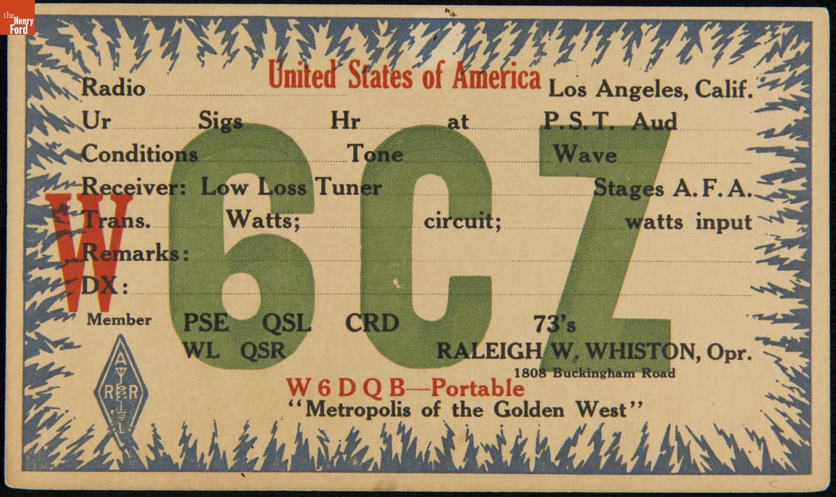 QSL Card of W6CZ (Raleigh W. Wiston, Los Angeles, California), 1924-1943