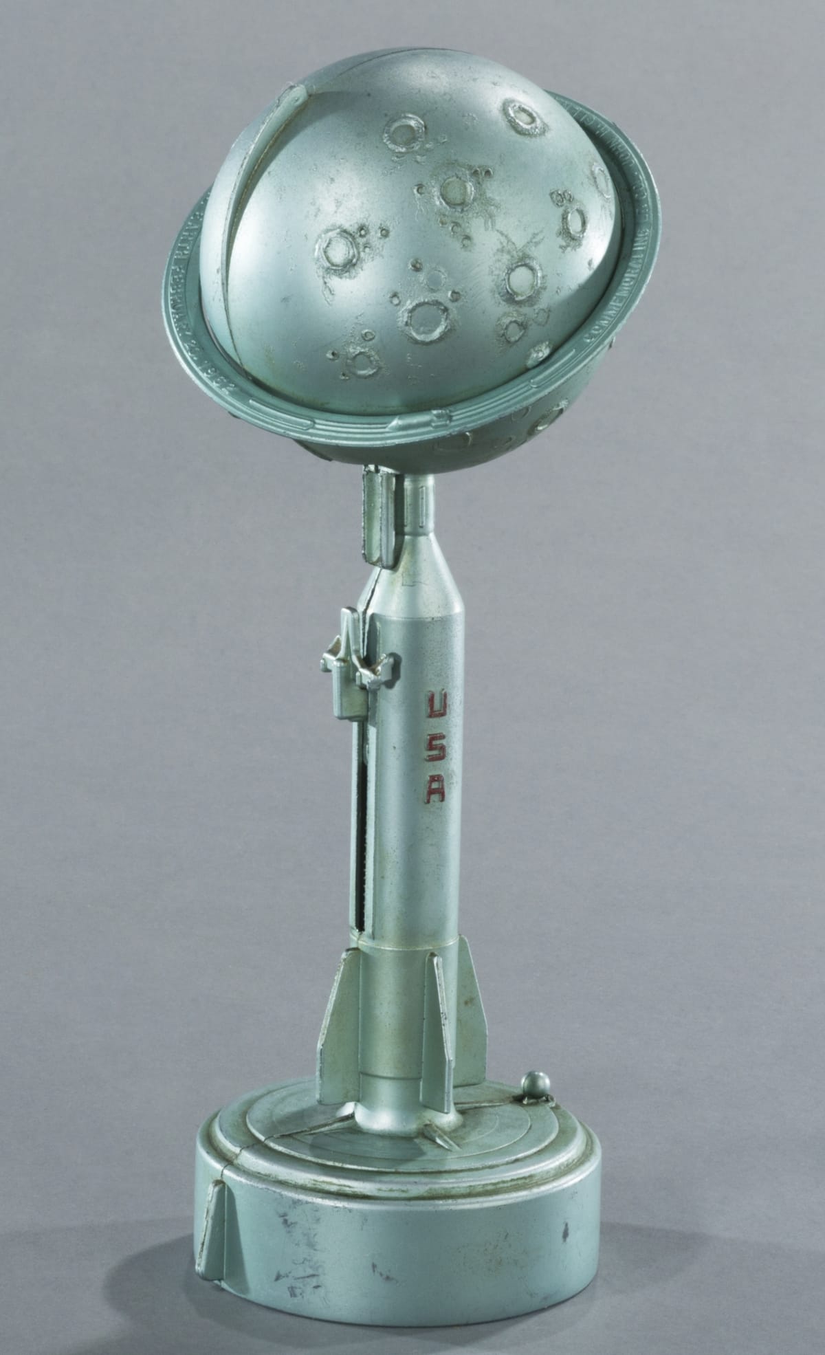 inside rim of base: MODEL - 1000 - / DESTINATION - MOON / BANK / 1ST US DIRECT HIT APRIL 26 - 1962 / DURO MOLD AND M.F.G. INC. / DETROIT 34 MICH. / U.S.A PAT. D-54,508 / CANADIAN PAT. D-25826 / OTHER COUNTRIES PEND. on side of rocket: U S A on top of rim around moon: COMMEMORATING LT. COL. JOHN H. GLENN JR. - TRIUMPHANT TRIPLE ORBIT OF THE EARTH FEBRUARY 20, 1962 on bottom of rim around moon: SHEPARD GRISSOM GLENN CARPENTER SCHIRRA