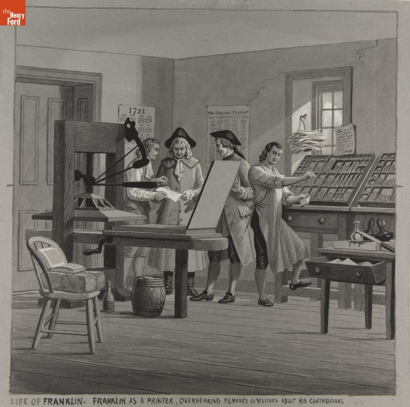 "Franklin as a Printer, Overhearing Remarks of Visitors about His Contributions," Drawing for Magic Lantern Slide, 1902-1903