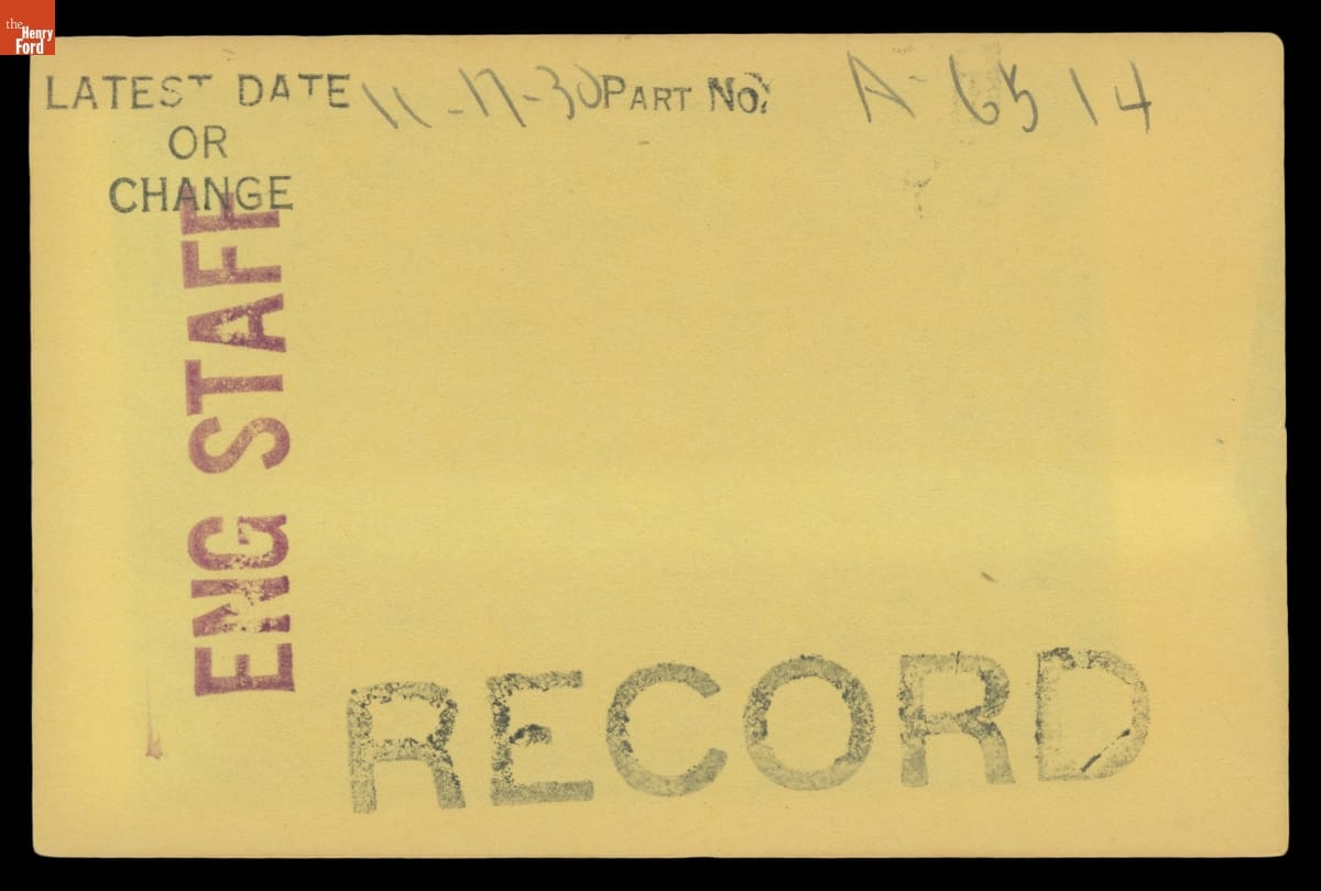 The Ford Motor Company created over a million parts drawings from 1903 to 1957. Many of these drawings specify engineering requirements for the components of Ford-made vehicles--including automobiles, trucks, tractors, military vehicles and Tri-motor airplanes. Others document assembly components, stages of casting and forging, or experimental designs. Beginning in the 1940s, Ford transferred the drawings to microfilm.