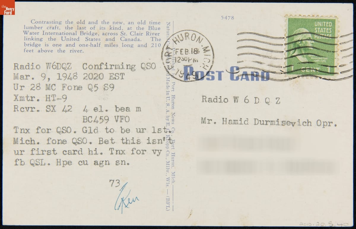 Blue Water International Bridge Depicted on QSL Card from W8DPU to W6DQZ (Hamid Durmisevich), March 9, 1948