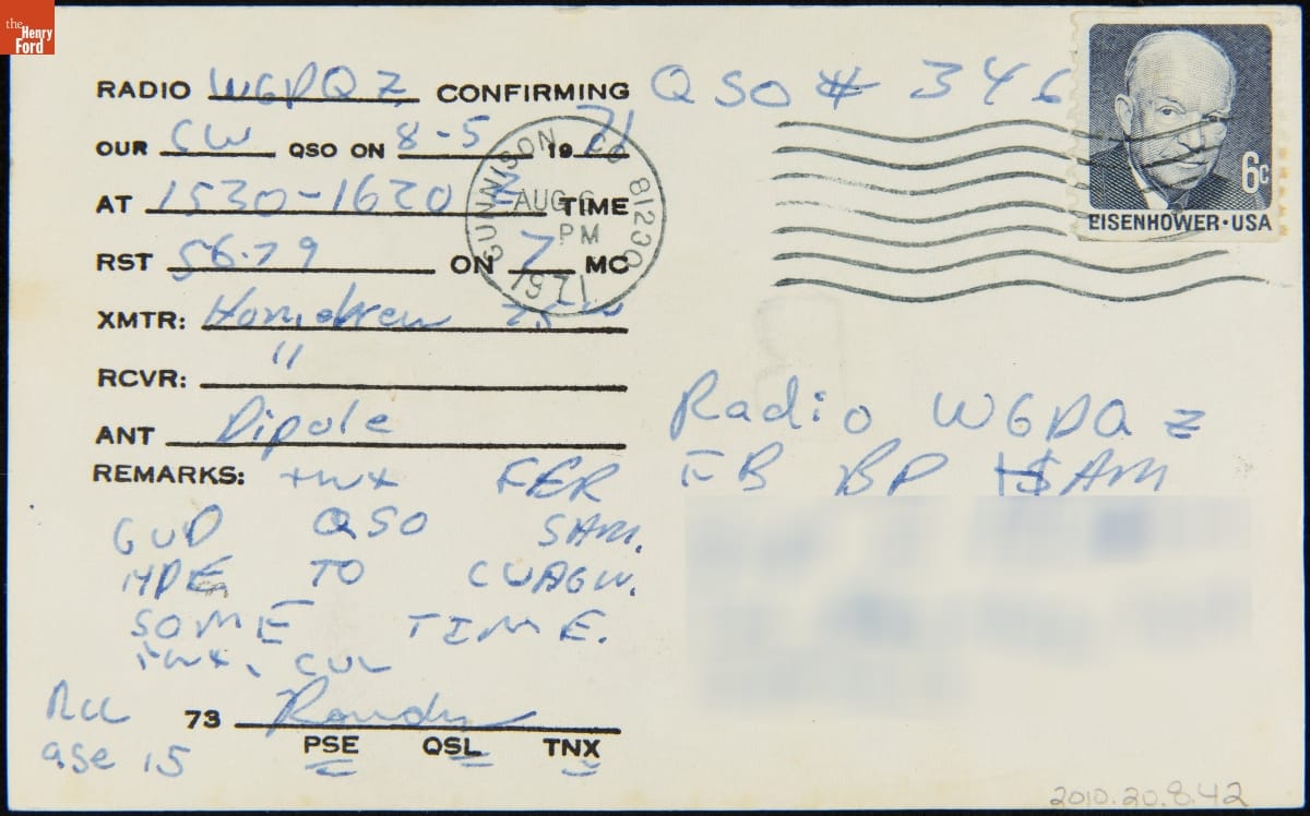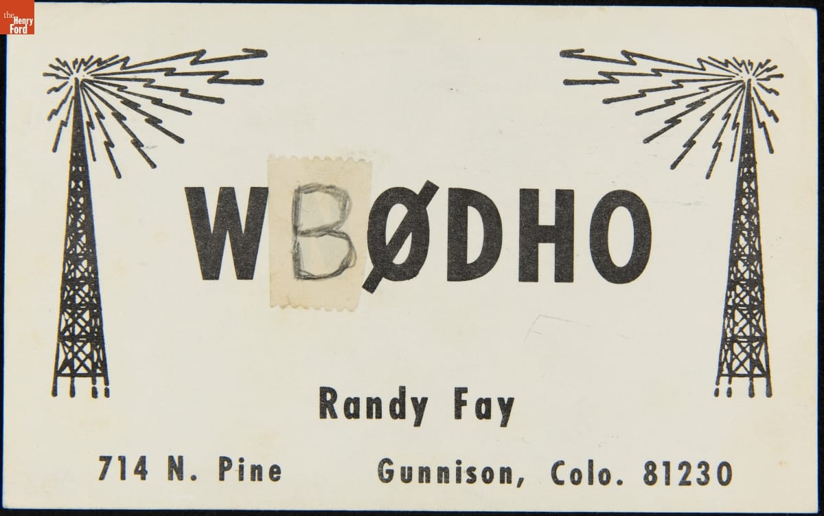 It was customary for ham radio operators (hams) to exchange these "QSL cards" with one another through the mail after their first conversation. Long-time hams amassed collections of thousands of cards, some from far-flung places. There is a story embedded in each example: the ham's call sign dominates the design, with additional details about location, reception reports, and weather conditions.