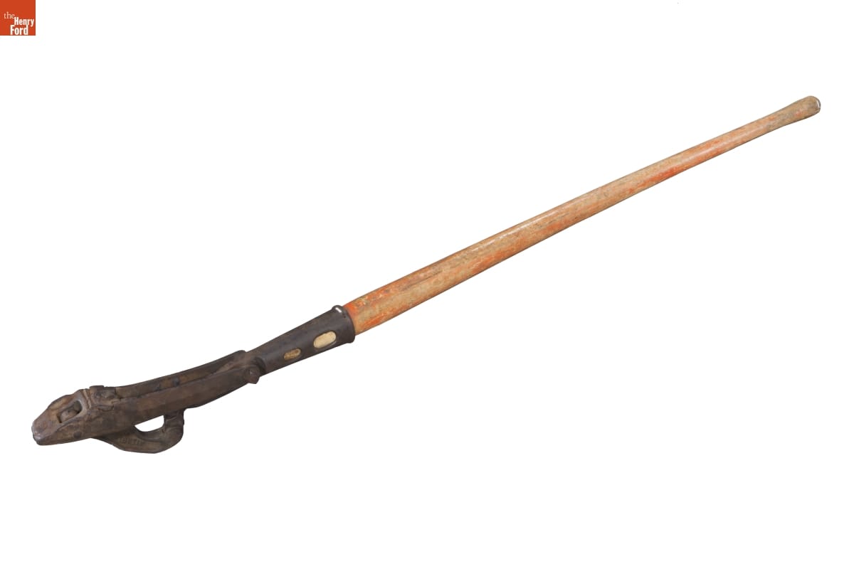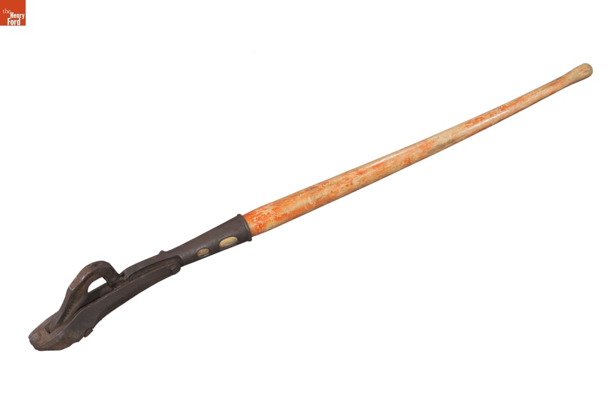 This tool allowed the user to move a railroad car by hand through the power of compound leverage. The user positioned the wedge under one of the car's wheels and pushed down on the handle. This motion simultaneously pressed a spur -- or fulcrum -- down onto the rail and pushed a small foot up against the wheel to ease the car forward.