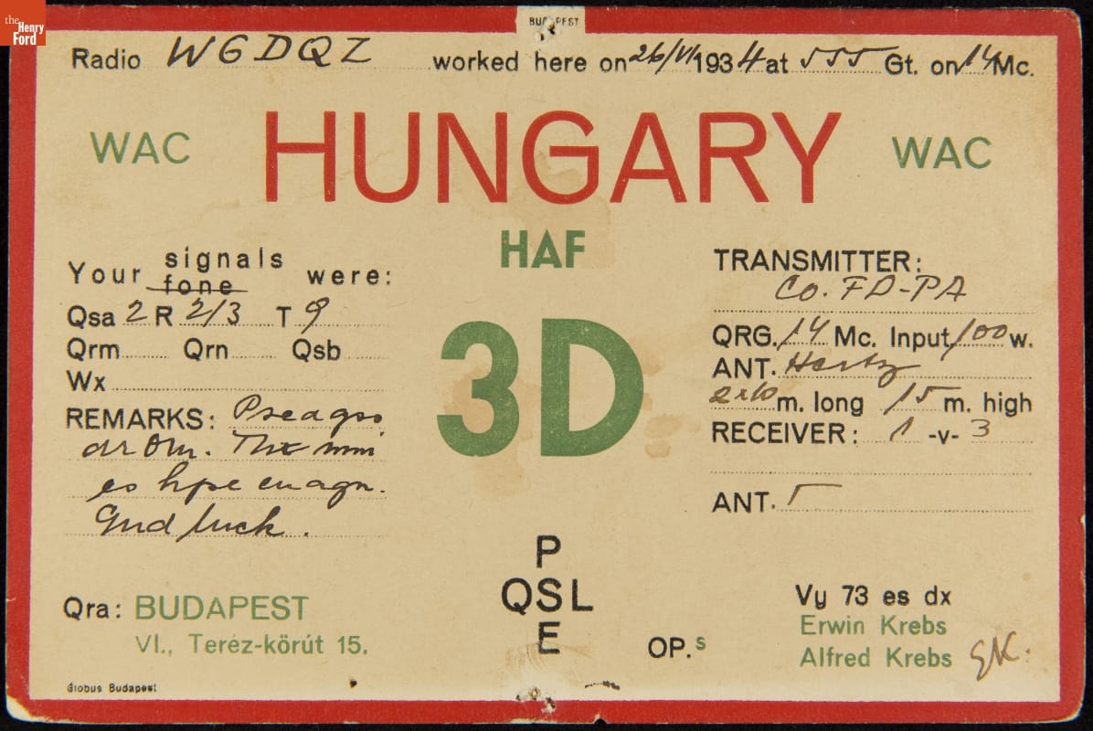 It was customary for ham radio operators (hams) to exchange these "QSL cards" with one another through the mail after their first conversation. Long-time hams amassed collections of thousands of cards, some from far-flung places. There is a story embedded in each example: the ham's call sign dominates the design, with additional details about location, reception reports, and weather conditions.