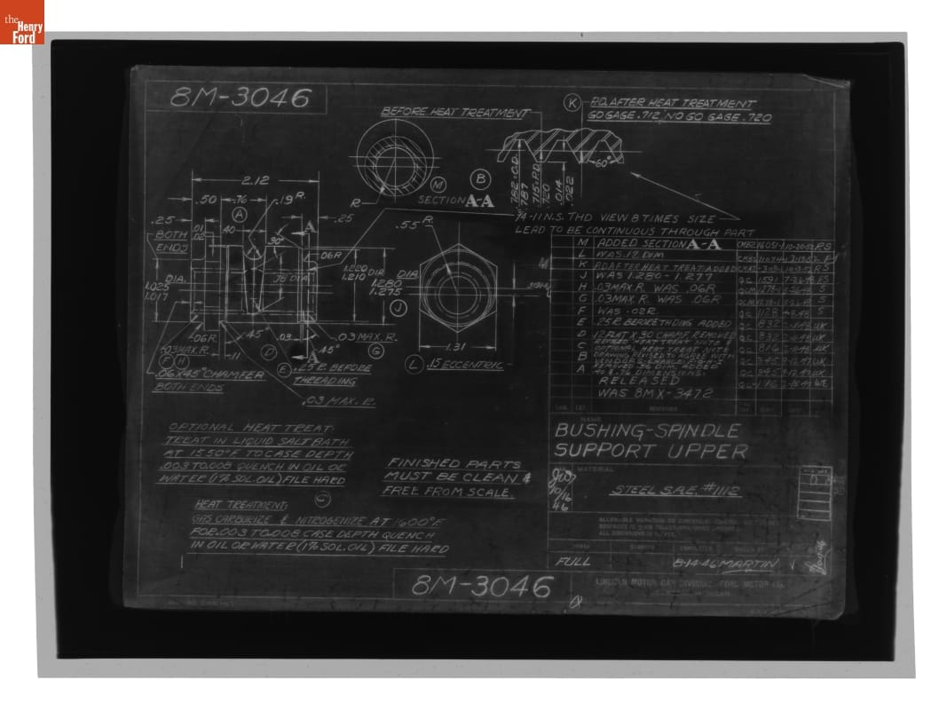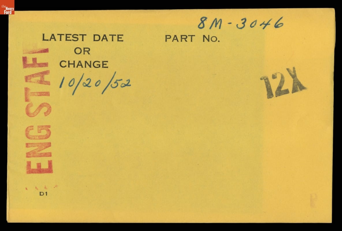 The Ford Motor Company created over a million parts drawings from 1903 to 1957. Many of these drawings specify engineering requirements for the components of Ford-made vehicles--including automobiles, trucks, tractors, military vehicles and Tri-motor airplanes. Others document assembly components, stages of casting and forging, or experimental designs. Beginning in the 1940s, Ford transferred the drawings to microfilm.