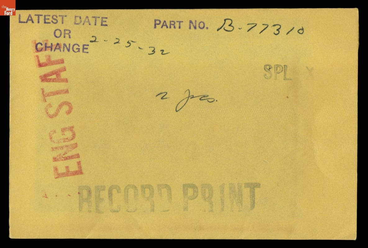 The Ford Motor Company created over a million parts drawings from 1903 to 1957. Many of these drawings specify engineering requirements for the components of Ford-made vehicles--including automobiles, trucks, tractors, military vehicles and Tri-motor airplanes. Others document assembly components, stages of casting and forging, or experimental designs. Beginning in the 1940s, Ford transferred the drawings to microfilm.