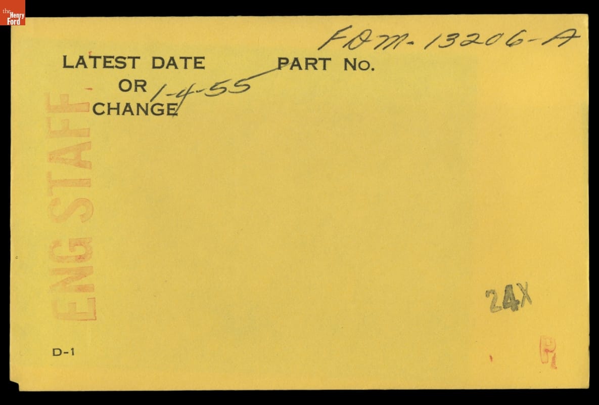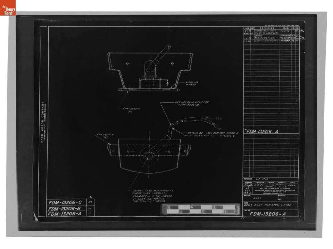 The Ford Motor Company created over a million parts drawings from 1903 to 1957. Many of these drawings specify engineering requirements for the components of Ford-made vehicles--including automobiles, trucks, tractors, military vehicles and Tri-motor airplanes. Others document assembly components, stages of casting and forging, or experimental designs. Beginning in the 1940s, Ford transferred the drawings to microfilm.