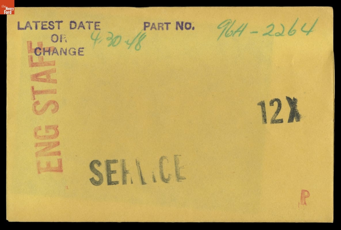 The Ford Motor Company created over a million parts drawings from 1903 to 1957. Many of these drawings specify engineering requirements for the components of Ford-made vehicles--including automobiles, trucks, tractors, military vehicles and Tri-motor airplanes. Others document assembly components, stages of casting and forging, or experimental designs. Beginning in the 1940s, Ford transferred the drawings to microfilm.