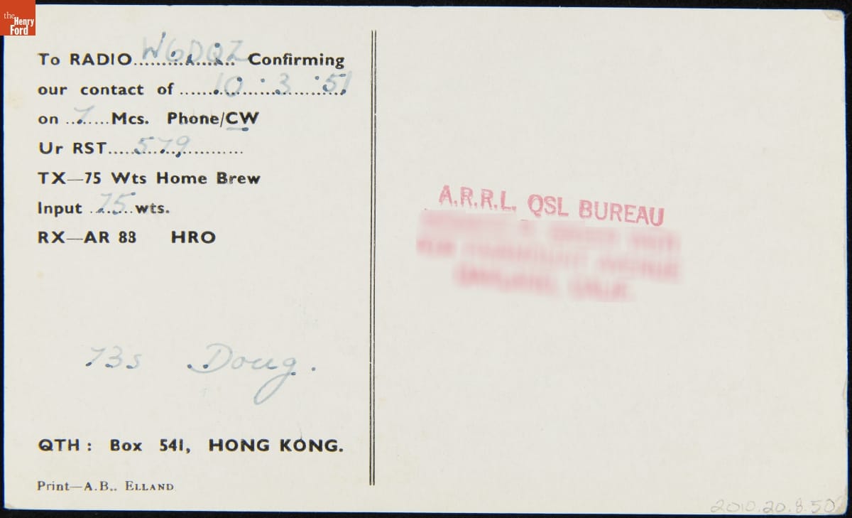 It was customary for ham radio operators (hams) to exchange these "QSL cards" with one another through the mail after their first conversation. Long-time hams amassed collections of thousands of cards, some from far-flung places. There is a story embedded in each example: the ham's call sign dominates the design, with additional details about location, reception reports, and weather conditions.