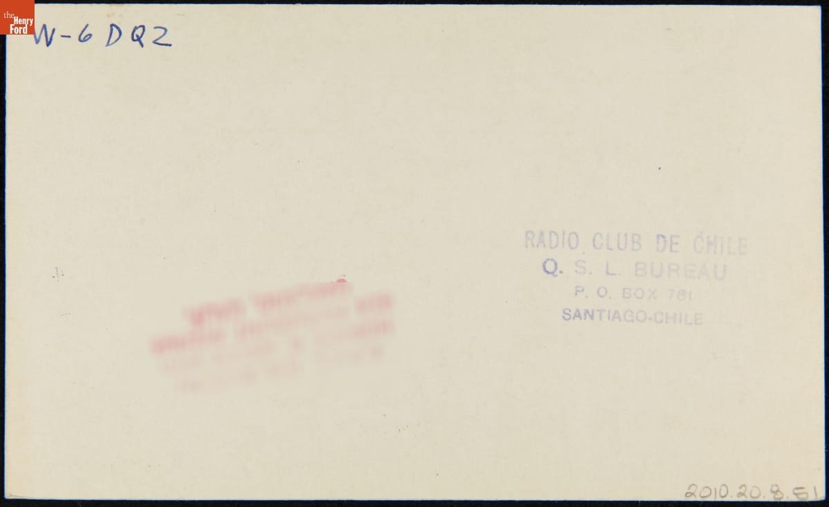 QSL Card from CE-3BW (Santiago, Chile) to W6DQZ (Hamid Durmisevich, Los Angeles, California), April 25, 1951