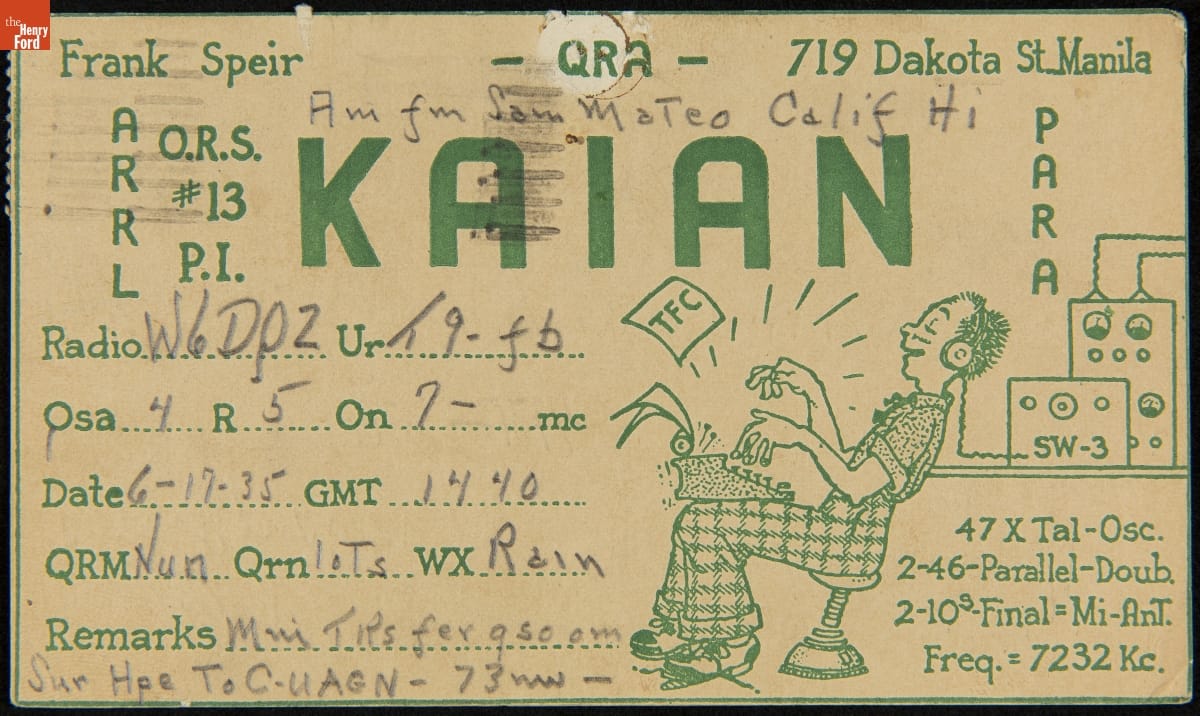 QSL Card from KAIAN (Frank Speir, Manila, Philippines) to W6DQZ (Hamid Durmisevich, Los Angeles, California), June 17, 1935