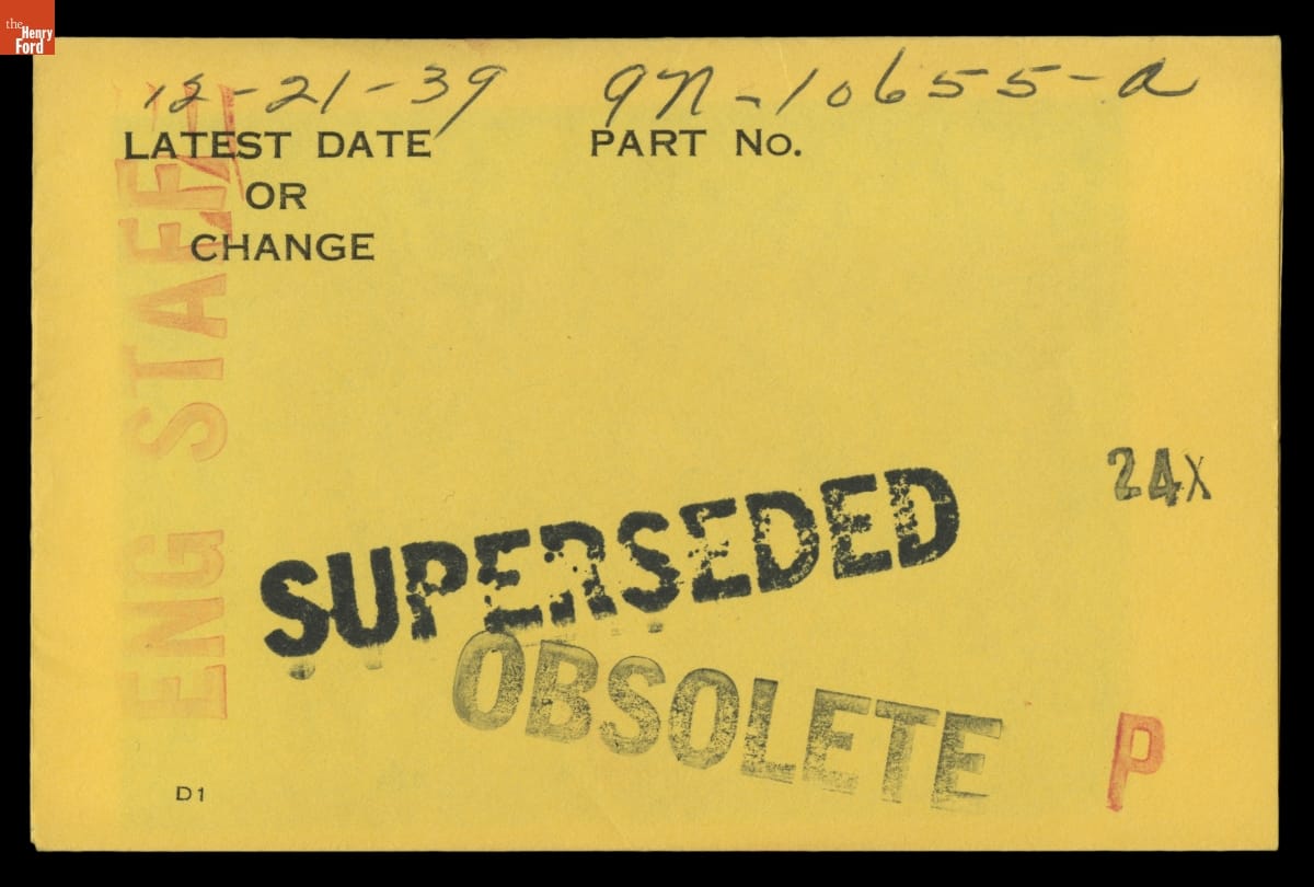 The Ford Motor Company created over a million parts drawings from 1903 to 1957. Many of these drawings specify engineering requirements for the components of Ford-made vehicles--including automobiles, trucks, tractors, military vehicles and Tri-motor airplanes. Others document assembly components, stages of casting and forging, or experimental designs. Beginning in the 1940s, Ford transferred the drawings to microfilm.