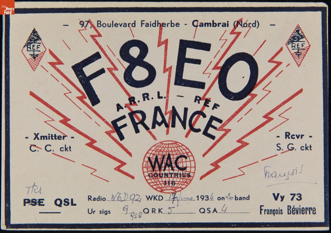 QSL Card from F8EO (Francois Bevierre, Cambrai, France) to W6DQZ (Hamid Durmisevich, Los Angeles, California), June 17, 1934