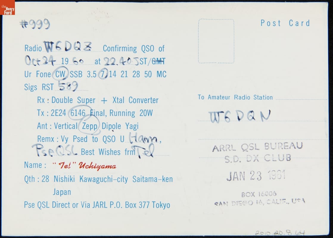 QSL Card from JA1BTG (Tokyo, Japan) to W6DQZ (Hamid Durmisevich, Los Angeles, California), October 24, 1960