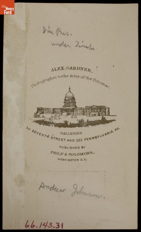 Cartes-de-visite, small, professionally made photographs on cardboard stock, remained popular in the United States from the Civil War in the 1860s through the 1880s. Many were given to friends and loved ones, but enterprising photographers also produced images of famous individuals to sell to the collecting-crazed public. Celebrities, military officers and politicians, such as President Andrew Johnson, were popular subjects.