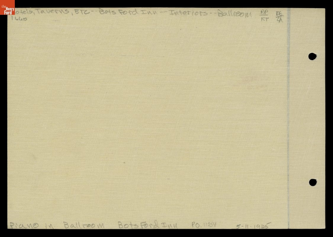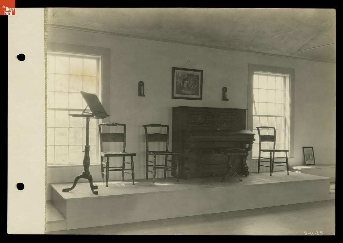 As a youth during the 1880s, Henry Ford had attended dances at the Botsford Inn, an 1836 tavern on the route from Detroit to Lansing, Michigan. After buying and restoring the building in 1924, Ford held some of his early "old-fashioned" dance parties in the inn's ballroom. This image shows the musicians' stage and the maple dance floor Ford installed there.