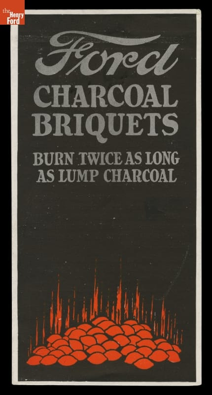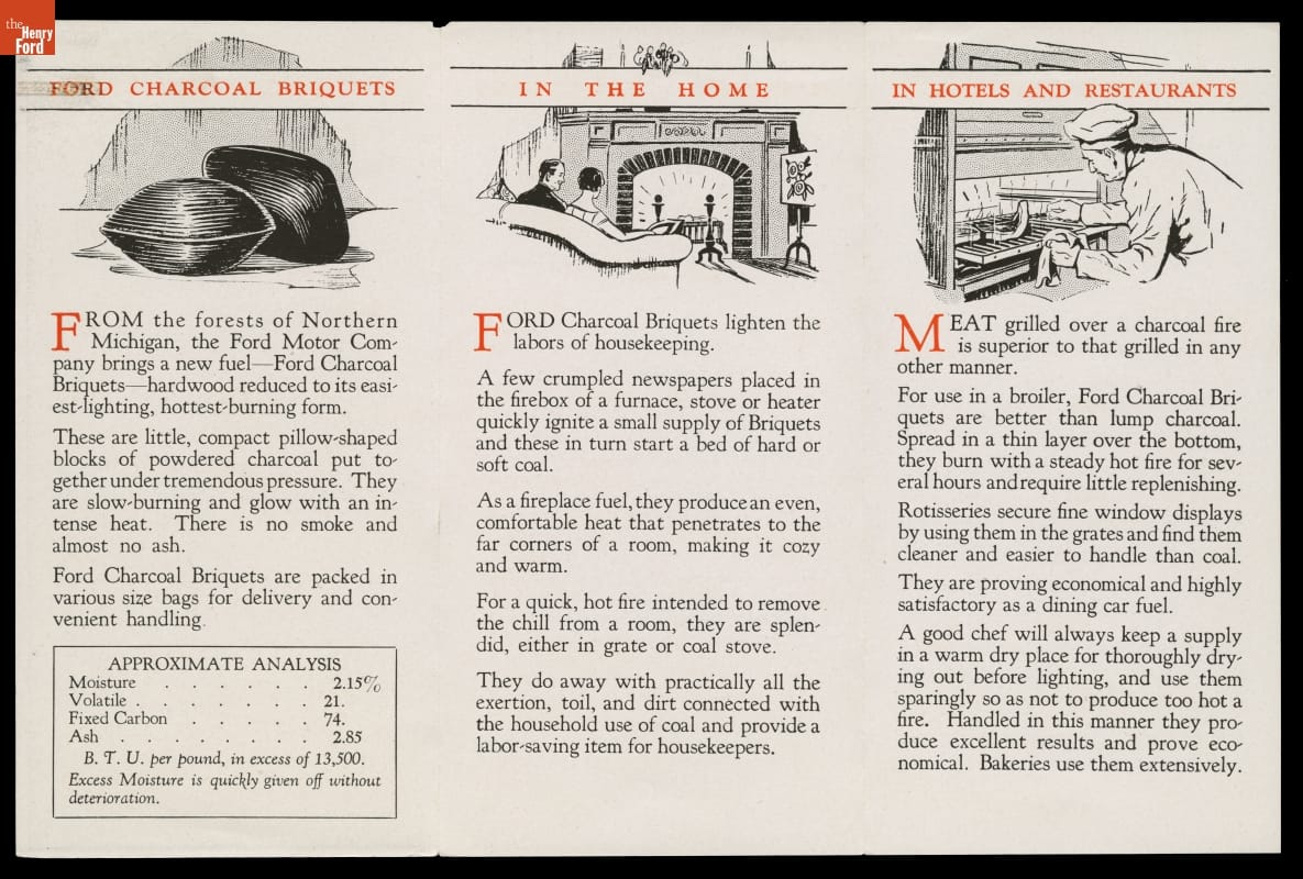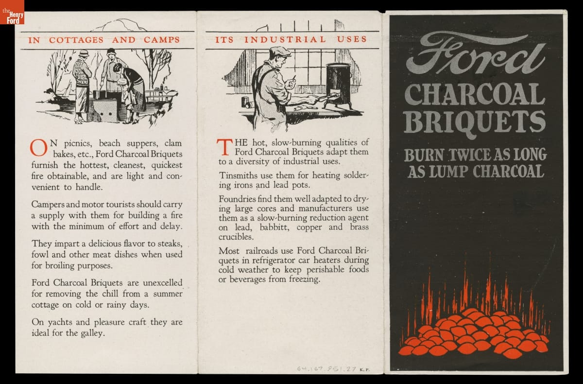 Ford Motor Company sawmills created heaps of wood wastes. Some was used to produce steam for factory operations. The rest was carbonized and compressed into charcoal. Workers mixed charred hardwood chips with starch, forming nearly 100 tons of charcoal briquettes each day. This 1930s brochure suggests the many uses for this Ford byproduct.