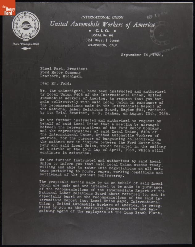 Starting in the early 1910s, Ford Motor Company established domestic assembly plants throughout the United States. Ford opened its Long Beach, California, assembly plant in 1930. This letter to company president Edsel Ford concerned relations with the local chapter of the United Auto Workers. Edsel Ford had a far more progressive and collaborative attitude toward unions than his father, Henry Ford.
